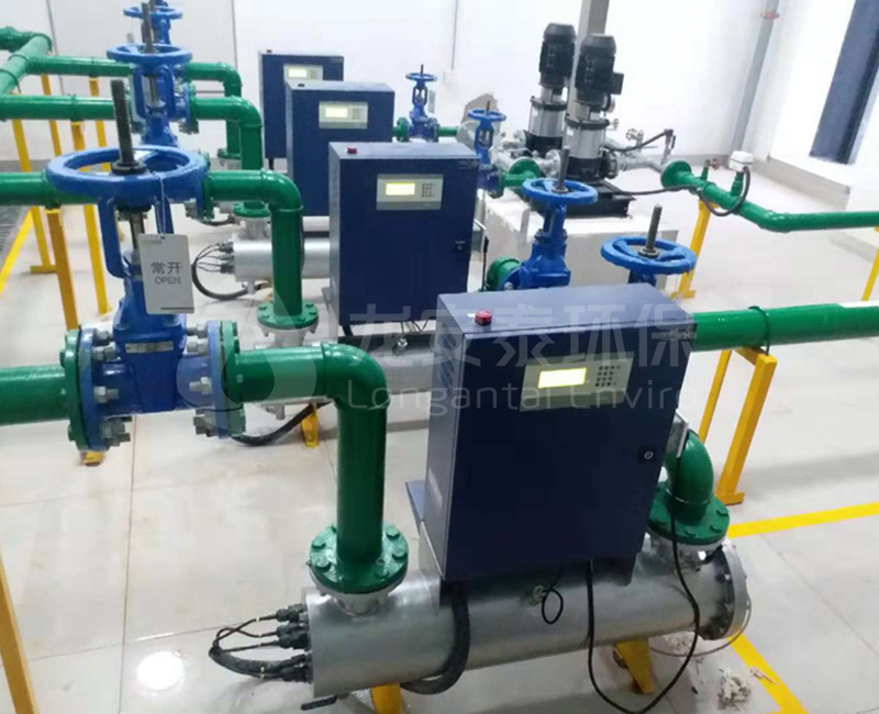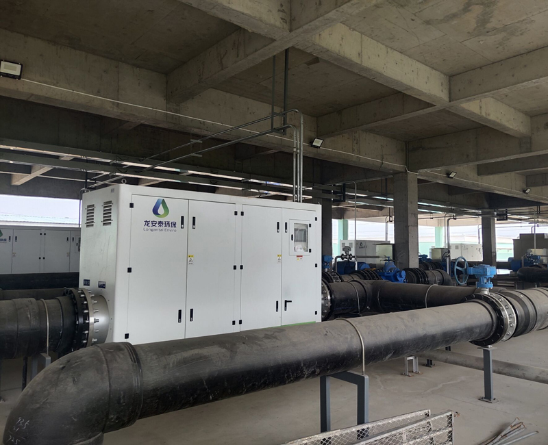 項目概述:天津某電廠利用垃圾燃燒的熱量發(fā)電。電廠共有兩臺發(fā)電機組,配備兩套循環(huán)水系統(tǒng),循環(huán)水量分別為2000m3/h和4000m3/h,兩臺機組的凝汽器材質(zhì)均為不銹鋼,空冷器、油冷器均為銅材質(zhì),配備龍安泰環(huán)保2套電化學設(shè)備及相關(guān)配套設(shè)施。經(jīng)過長時間的穩(wěn)定運行,循環(huán)水處理效果良好,阻垢、緩蝕效果顯著。循環(huán)水水質(zhì):循環(huán)水補水為污水廠中水,循環(huán)水系統(tǒng)結(jié)垢、腐蝕情況的控制難度大,綠藻滋生嚴重。循環(huán)水量:6