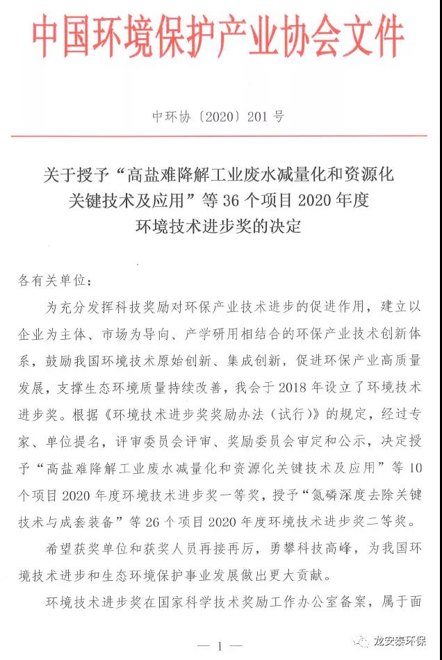 喜訊 | 龍安泰環(huán)保榮獲中國(guó)環(huán)境保護(hù)產(chǎn)業(yè)2020年度環(huán)境技術(shù)進(jìn)步一等獎(jiǎng)