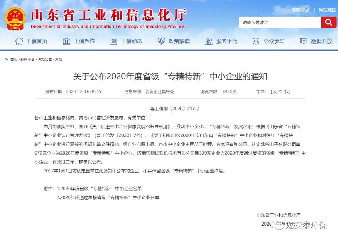 喜訊 | 熱烈祝賀龍安泰環(huán)保獲評(píng)2020年度山東省“專精特新”中小企業(yè)