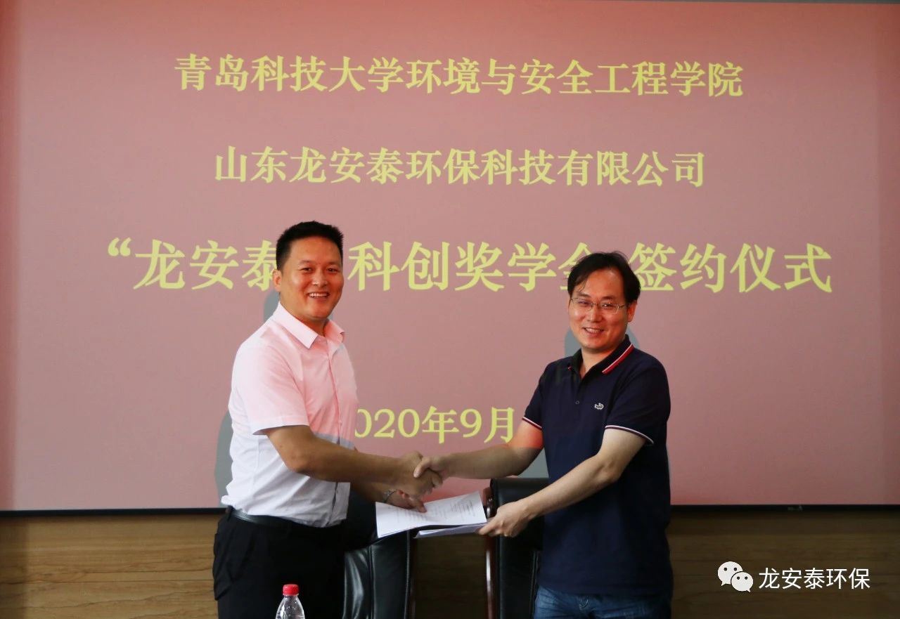 9月8日,龍安泰環保與青島科技大學在青島科技大學會議室舉行“龍安泰科創”獎學金簽約儀式,龍安泰環保董事長代春龍、青島科技大學環境與安全工程學院院長王磊、黨總支書記王青、副院長周貴忠等學院主要領導出席了簽署儀式。簽約儀式上,龍安泰環保董事長代春龍先生表示:當今世界正經歷前所未有的大變局,中國也正處在新時代民族復興的偉大時刻,需要更多優秀的有志青年積極投入國家的科研之中,龍安泰環保同青島科技大學成立科...