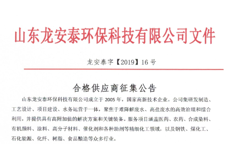 山東龍安泰環(huán)保科技有限公司合格供應(yīng)商征集公告